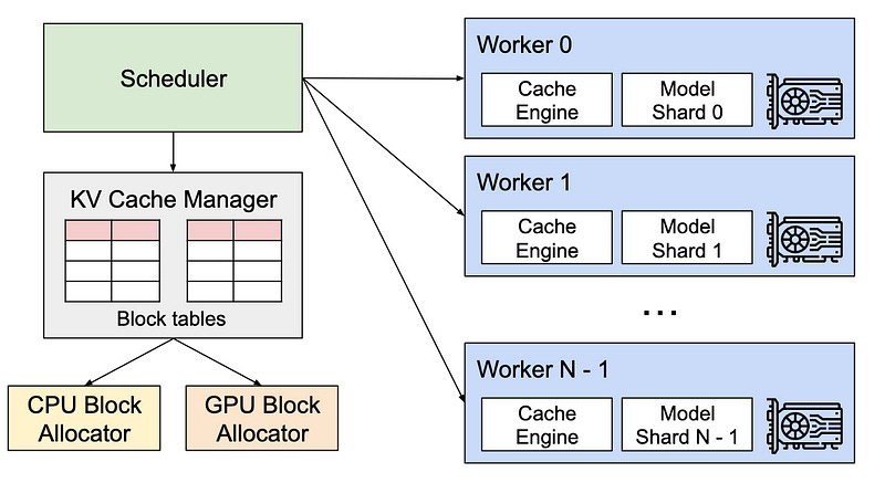 PagedAttention is the heart of vLLM’s performance enhancements. It addresses the critical issue of memory management in LLM serving by partitioning the KV cache into blocks, allowing for non-contiguous storage of keys and values in memory. This approach not only optimizes memory usage, reducing waste by up to 96%, but also enables efficient memory sharing, significantly reducing the memory overhead of complex sampling algorithms. PagedAttention’s memory management strategy is inspired by the concept of virtual memory and paging in operating systems, offering a flexible and efficient way to manage memory resources.